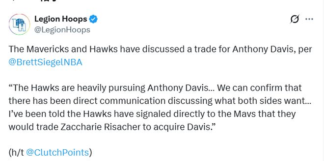 北京时间12月31日,据名记Siegel报道,联盟消息人士透露,老鹰已与独行侠就交易戴维斯事宜展开谈判。尽管联盟多数人认为老鹰目前不会为得到戴维斯孤注一掷,但球队方面显然认定这位独行侠明星内线就是他们需要的交易核心。