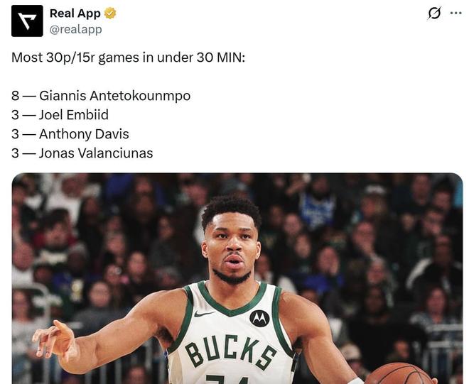 凭借这样的表现,字母哥生涯已经第8次在30分钟内至少拿到30分15篮板,高居NBA历史第一,并列排在第二名的恩比德、浓眉与瓦兰均只有3次。