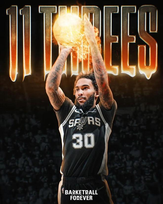 此外,11记三分还打破了马刺的队史三分纪录,此前的纪录是由查克珀森在1997年投进的单场9记三分,此外瓦塞尔、文班亚马、米尔斯、丹尼格林、吉诺比利等人都曾投进8记三分。