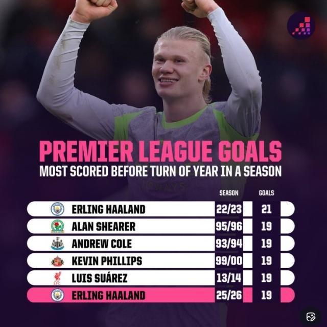 12月31日讯 2025年英超战罢,数据网站OPTA也盘点了英超历史在新年之前射手榜,其中本赛季哈兰德19球并列次席,纪录也由自己保持。