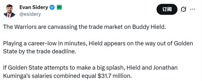 名记Sidery报道称,勇士队正在交易市场上兜售希尔德,本赛季希尔德的出场时间创下职业生涯新低,看起来他大概率会在交易截止日前离开金州。若勇士队有意促成一笔重磅交易,希尔德与库明加两人的薪资合计可达3170万美元。因此,打包交易两人,是具备可行性的。
